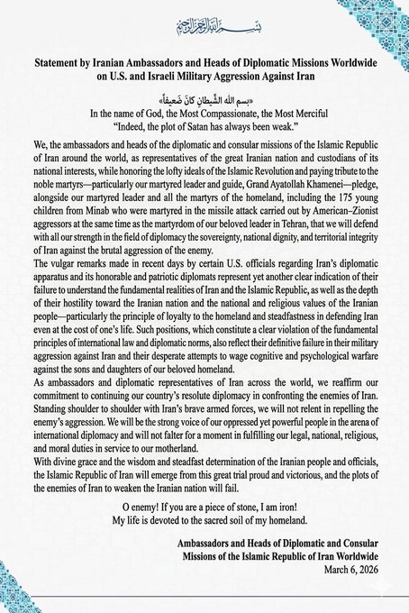 Statement by Iranian Ambassadors Heads of Diplomatic Missions Worldwide on U.S. Israeli Military Aggression against Iran