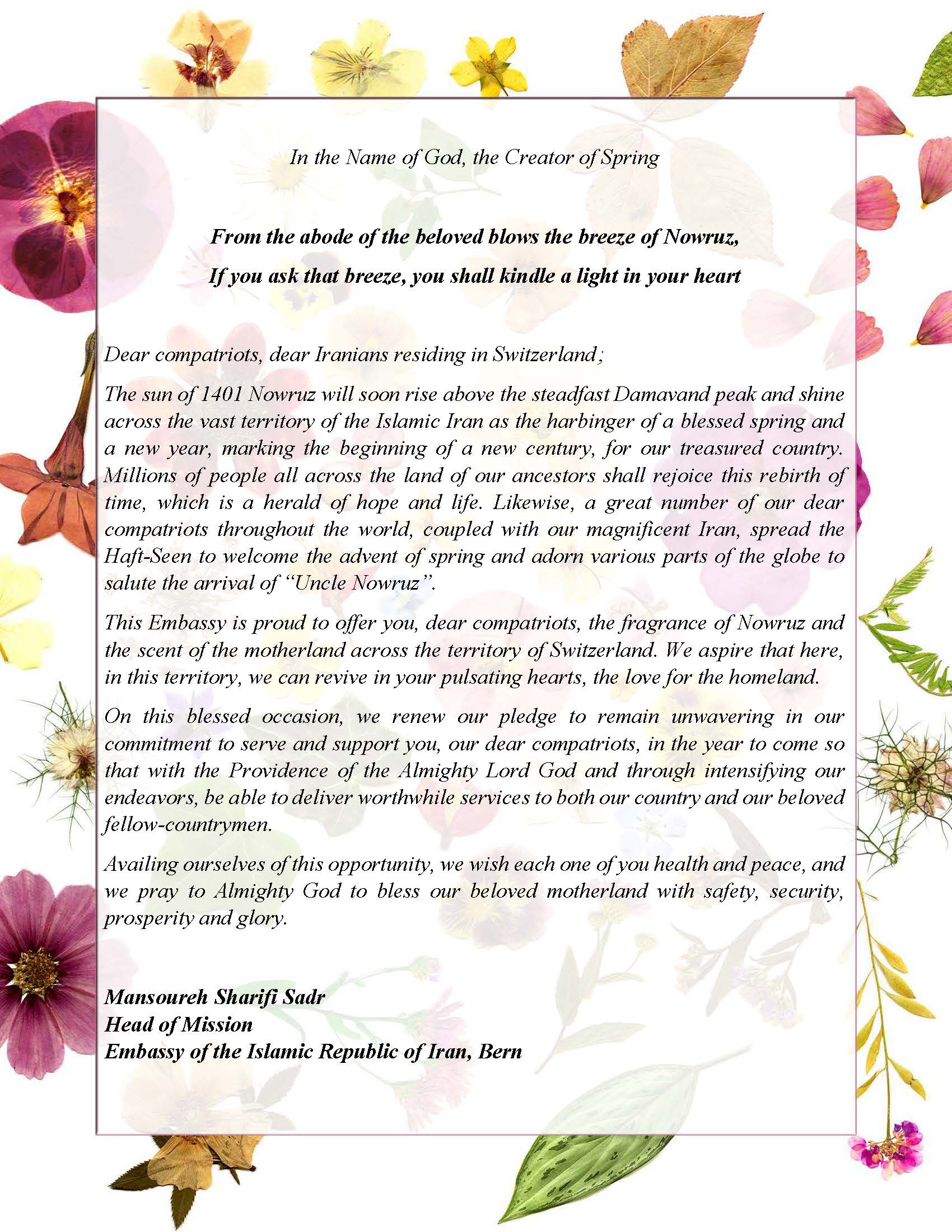 Message of Head of Mission, Ms. Mansoureh Sharifi Sadr, on the Occasion of Nowruz