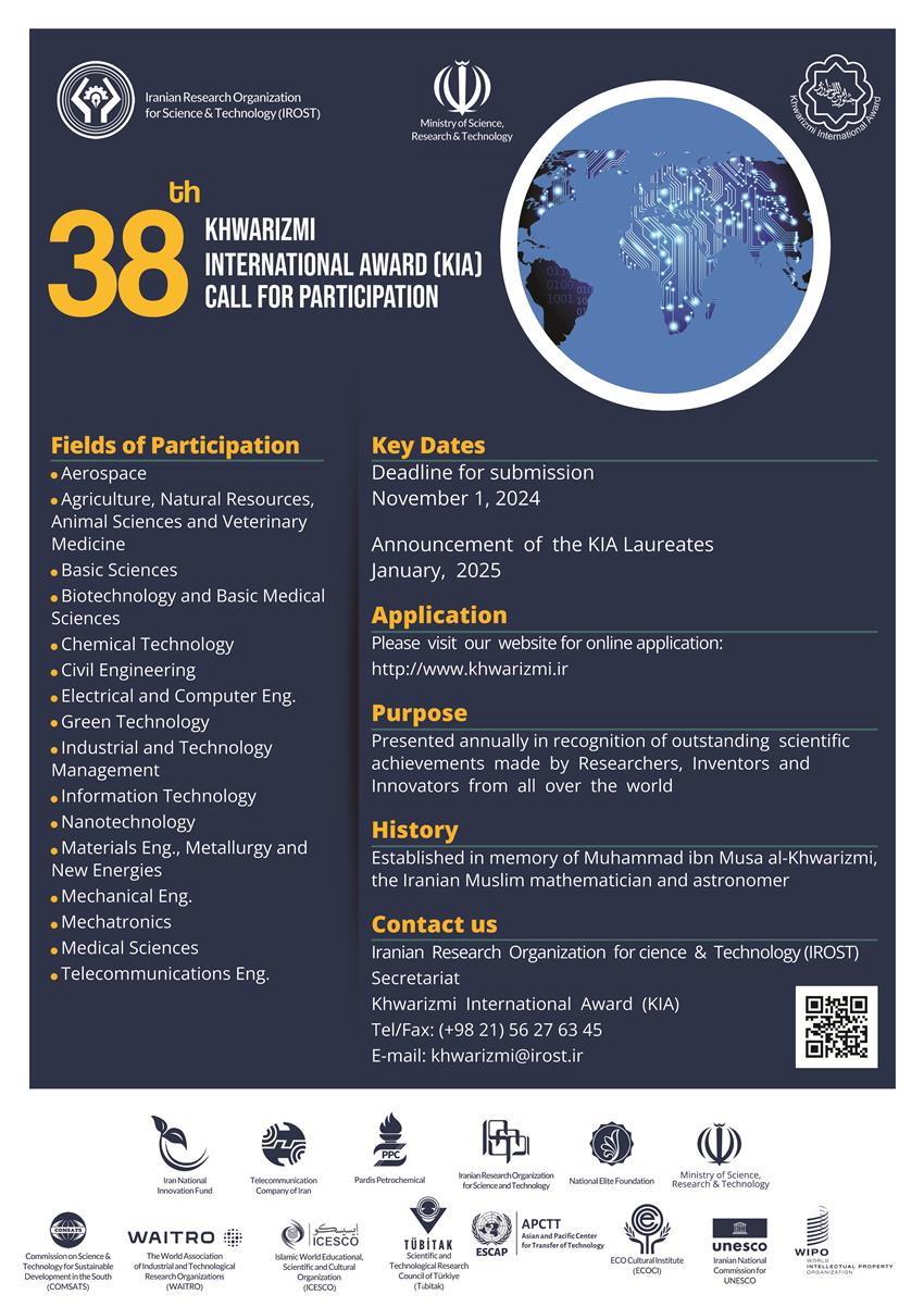 The 38th Khwarizmi International Award (KIA) invites researchers inventors and innovators from around the world to present their outstanding scientific achievements. This prestigious event aims to recognize and celebrate significant contributions to various fields of science and technology.