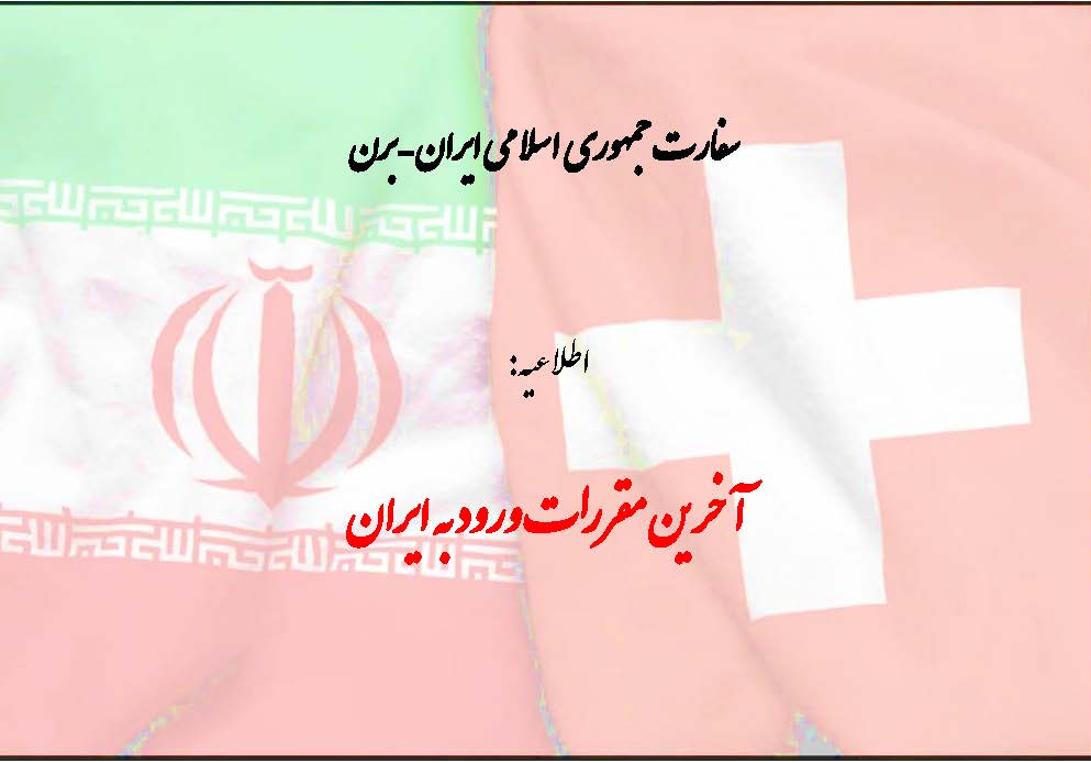 سفارت جمهوری اسلامی ایران در برن به استحضار متقاضیان سفر به ایران می رساند که به علت گسترش شیوع کورونا در ایران، از تاریخ ۳۱ مرداد ۱۴۰۰، کلیه مسافرین ورودی به ایران، از جمله کسانی که واکسینه شده اند، باید تست PCR منفی کووید ۱۹ در فرودگاهها و مبادی ورودی به کشور ارائه کنند.