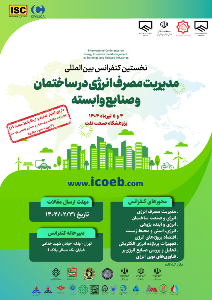 نخستین کنفرانس بین‌المللی مدیریت مصرف انرژی در ساختمان و صنایع وابسته، چهارم و پنجم تیر ۱۴۰۴ در مرکز همایش‌های بین‌المللی پژوهشگاه صنعت نفت تهران برگزار می‌شود. علاقمندان میتوانند جهت کسب اطلاعات بیشتر به آدرس https://icoeb.com/ مراجعه نمایند. شایان ذکر است که این کنفرانس دارای امتیاز تمدید و ارتقا پایه می‌باشد.