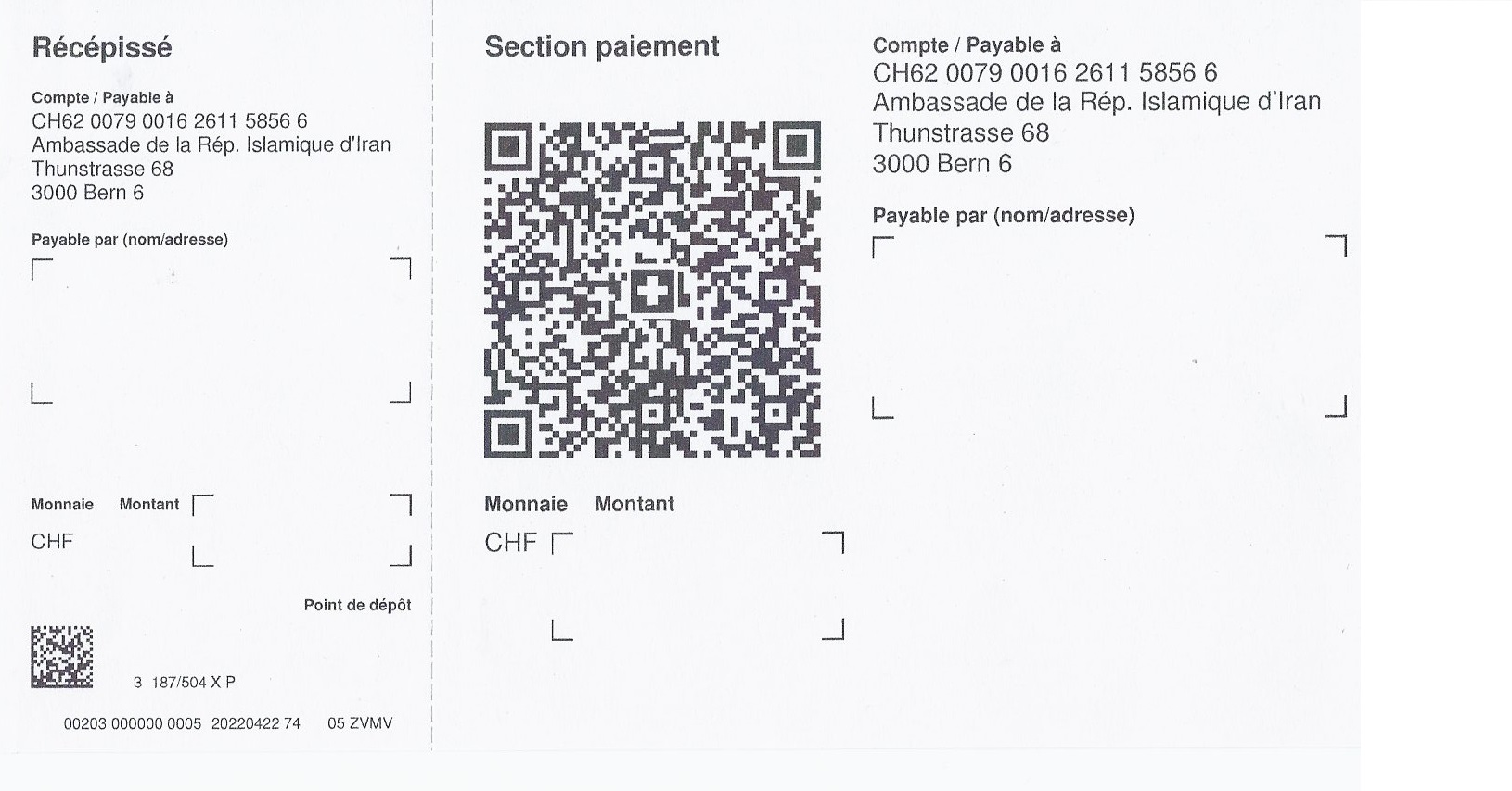 لطفاٌ از واریز هزینه‌های خدمات کنسولی به حساب سفارت از طریق بانکهای  UBS BANK,Credit Suiss BANK,Zurcher Kantonal BANK و بانکهای اینترنتی (همچون Revolut) خودداری نمائید