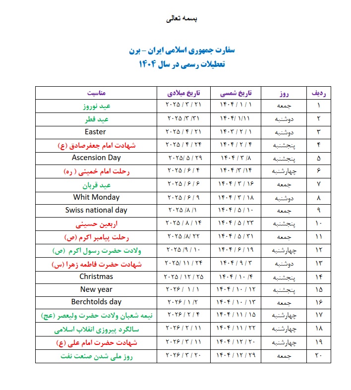 جدول تعطلیلات رسمی سفارت در سال 1404